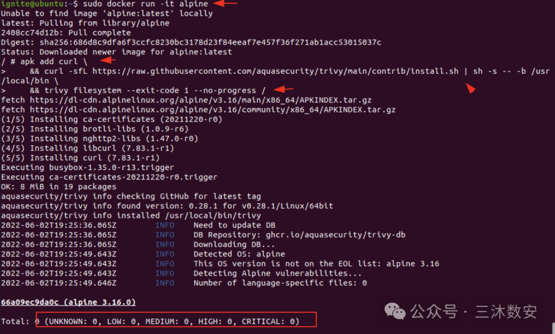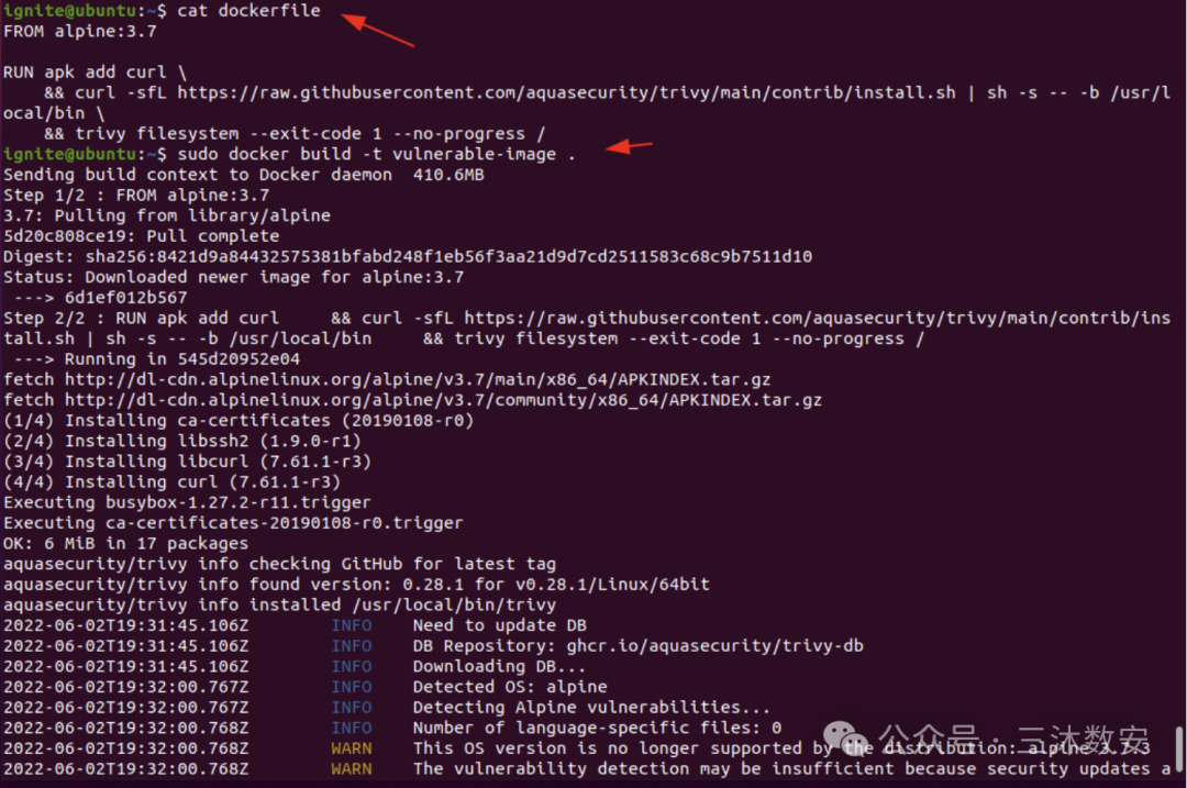 您还可以通过将 Trivy 嵌入 Dockerfile 中来扫描镜像作为构建过程的一部分。此方法可用于更新当前使用 Aqua 的 Micro 扫描仪的 Dockerfile。按照以下步骤在构建 docker 文件时对其进行扫描。