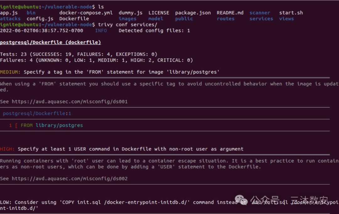 它将在构建镜像时扫描docker文件并给出如下所示的报告。