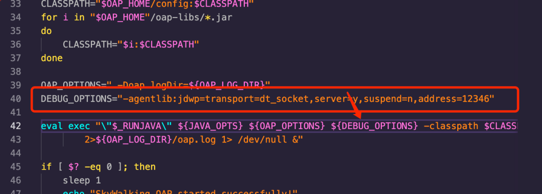 oap和webapp两个service组成,我们的几个漏洞都位于oap中,在oapservice.sh中,在启动语句中加入调试命令即可:
