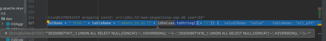 然而官方对于上面注入的修复不完善,还存在着一处queryLog注入,漏洞点位于org.apache.skywalking.oap.server.storage.plugin.jdbc.h2.dao.H2LogQueryDAO#queryLogs: