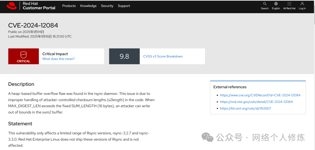 Rsync 最近爆出一个重大漏洞(CVE-2024-12084),CVSS 评分为 9.8。该漏洞仅存在于 Rsync 3.2.7 和 3.3.0 版本中。为了解决这一安全问题,建议将 Rsync 升级到 3.4.0 或更高版本。当前最新版本为 3.4.1(官网链接https://rsync.samba.org/)。