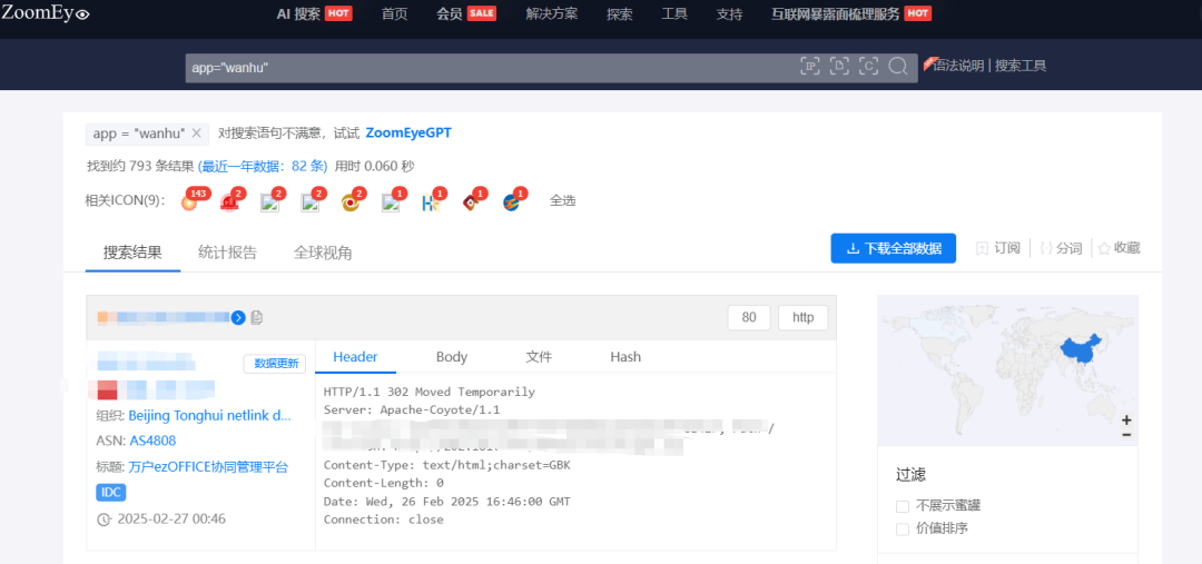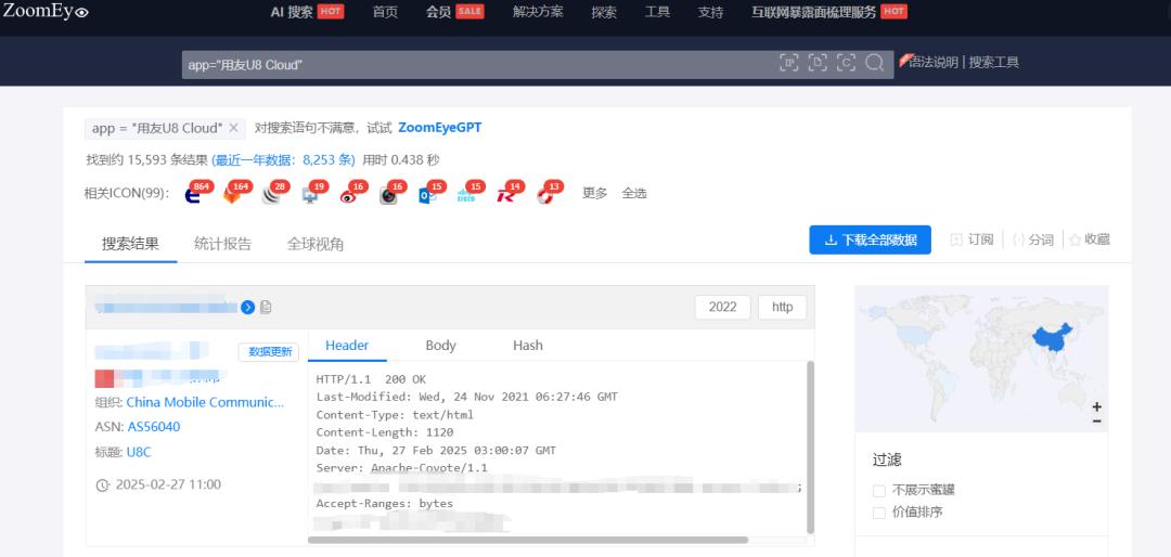 根据ZoomEye网络空间搜索引擎关键字 app=”用友U8 Cloud” 对潜在可能目标进行搜索,共得到15593条IP历史记录。主要分布在中国、美国等国家。(ZoomEye搜索链接:
