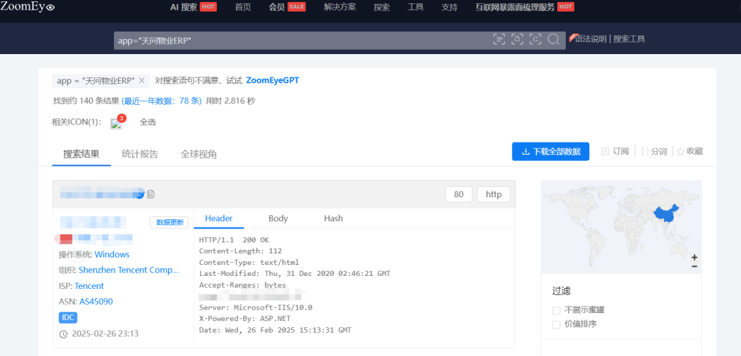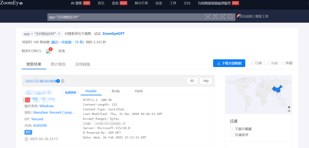 根据ZoomEye网络空间搜索引擎关键字 app=”天问物业ERP” 对潜在可能目标进行搜索,共得到140条IP历史记录。主要分布在中国广东、北京等地。(ZoomEye搜索链接: