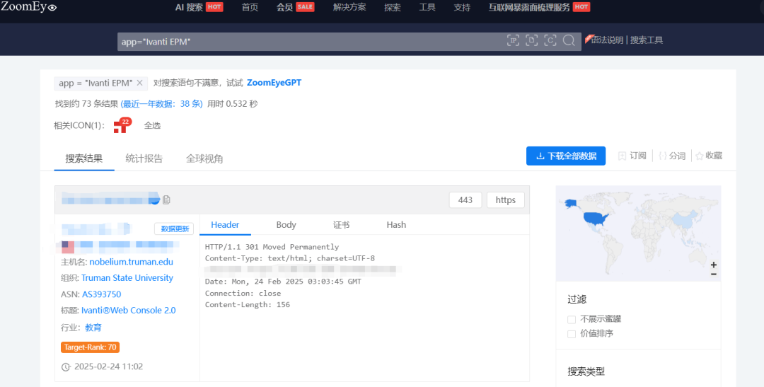 根据ZoomEye网络空间搜索引擎关键字 app=”Ivanti EPM” 对潜在可能目标进行搜索,共得到73条IP历史记录。主要分布在美国、新加坡等国家。(ZoomEye搜索链接: