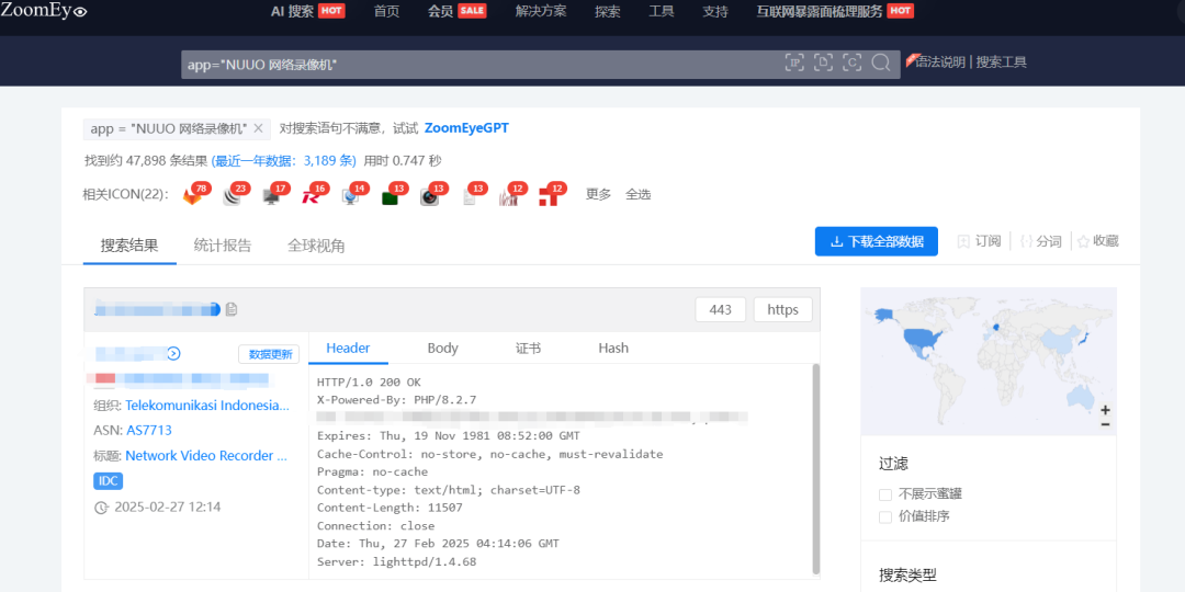 根据ZoomEye网络空间搜索引擎关键字 app=”NUUO 网络录像机” 对潜在可能目标进行搜索,共得到47898条IP历史记录。主要分布在德国、日本等国家。(ZoomEye搜索链接: