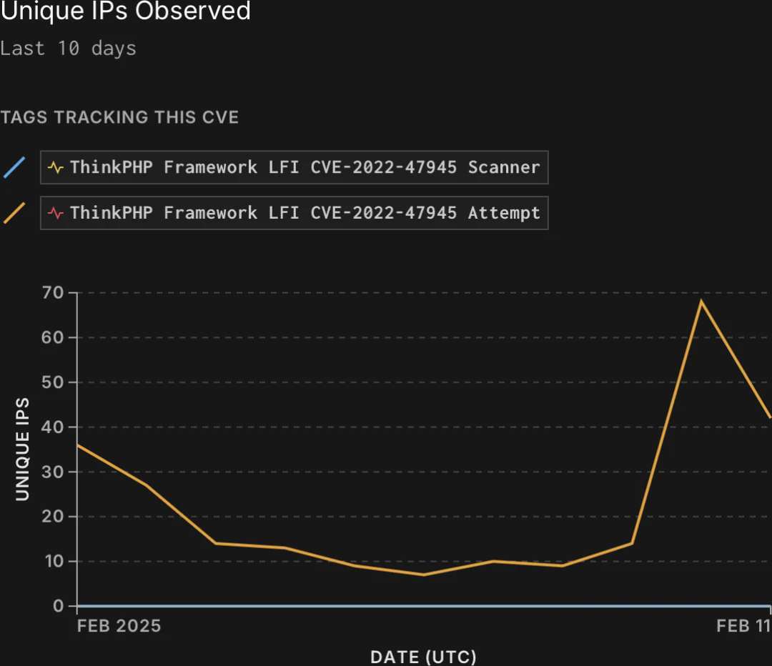 根据威胁监测平台GreyNoise的说法,CVE-2022-47945目前正受到大量利用,攻击的源ip越来越多。