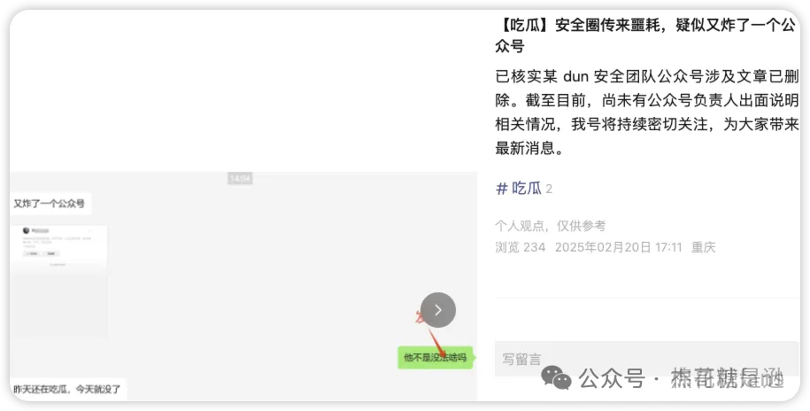 圈内漏洞文库类公众号疑似上所 发布于2025年2月21日2025年7月19日 作者:cve-20 圈内漏洞文库类公众号疑似上所 杰哥就是逊 2025-02-21 02:31 该公众号号主 给请喝茶 回来后连夜删文