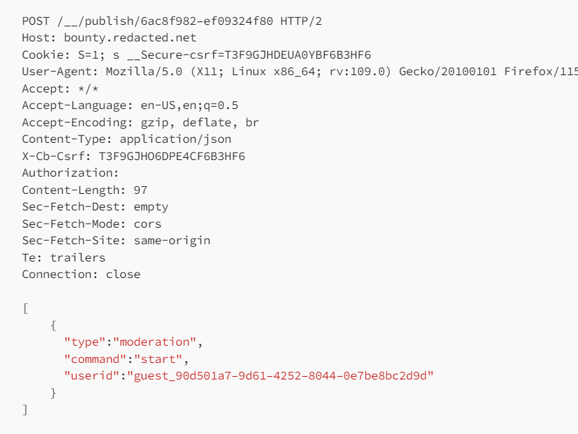 POST /__/publish/6ac8f982–ef09324f80 HTTP/2Host: bounty.redacted.netCookie: S=1; __Secure-csrf=T3F9GJHDEUA0YBF6B3HF6User-Agent: Mozilla/5.0 (X11; Linux x86_64; rv:109.0) Gecko/20100101 Firefox/115.0Accept: */*Accept-Language: en-US,en;q=0.5Accept-Encoding: gzip, deflate, brContent-Type: application/jsonX-Cb-Csrf: T3F9GJHO6DPE4CF6B3HF6Authorization: Content-Length: 97Sec-Fetch-Dest: emptySec-Fetch-Mode: corsSec-Fetch-Site: same-originTe: trailersConnection: close[ { "type":"moderation", "command":"start", "userid":"guest_90d501a7–9d61–4252–8044–0e7be8bc2d9d" }]