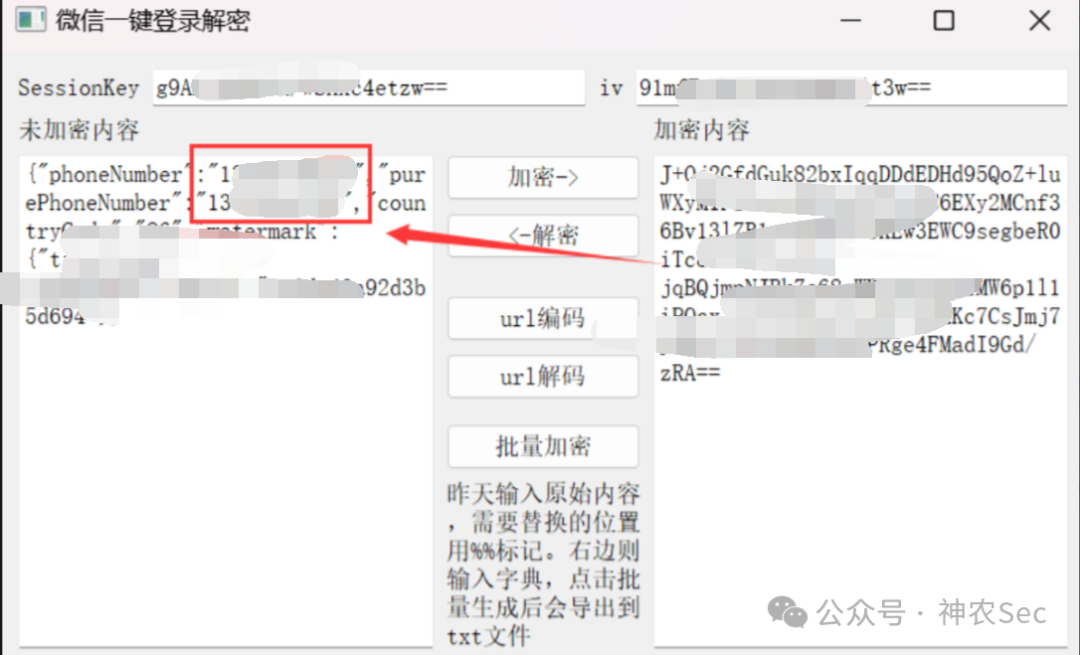 然后再使用Wx_SessionKey_crypt这个加解密的工具进行解密,可以看到解密出来开始一键微信登录的手机号