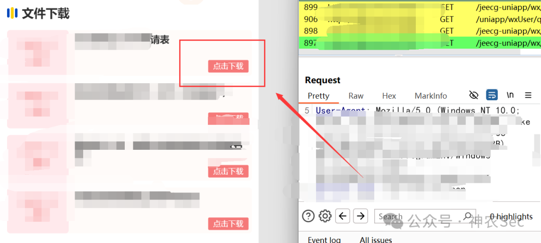 那么我们就得判断是不是路径的问题,那么我们怎么去找正确的文件存储的位置呢,下面就刚好看到了文件下载的功能点,点击尝试下载,然后看看数据包里面文件路径