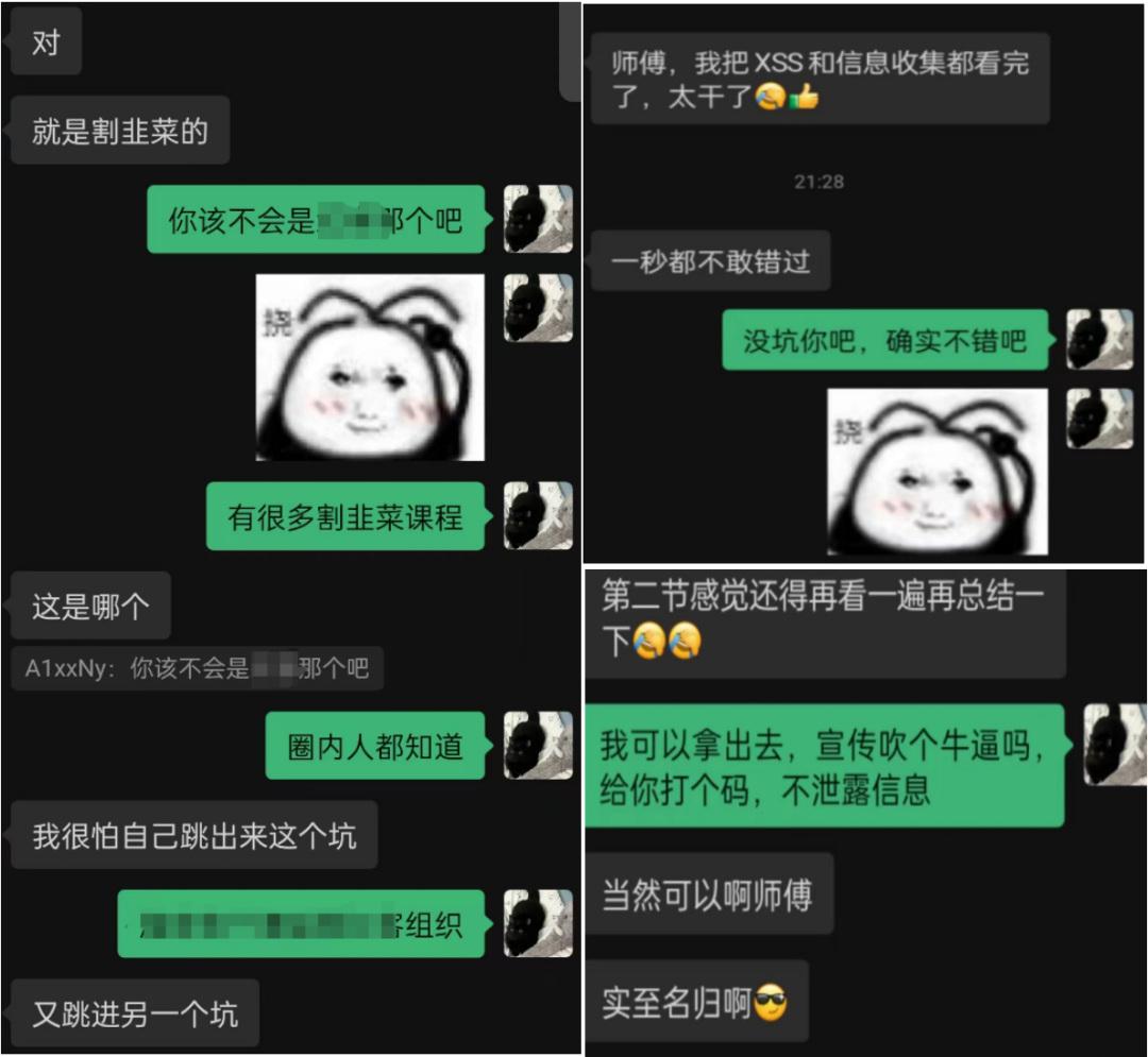 有师傅之前被割韭菜课程坑怕过,来我这里报名后,不仅价格便宜,内容全程干货教学,直接逐帧学习,无论是赏金挖掘还是工作项目,都进步神速!还提供全天的技术咨询服务!