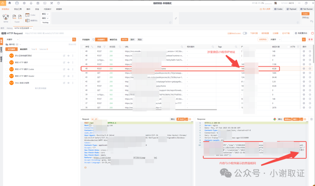 这个时候是全局抓包 也就是你电脑上所有的流量包,虽然数据包比较多,但只需关注一下最新的流量包,再对应一下响应包里的内容与小程序界面的内容对应即可。但也是能抓到小程序的流量包。