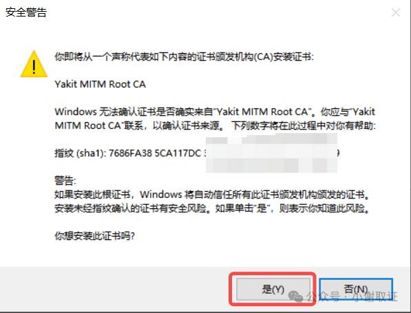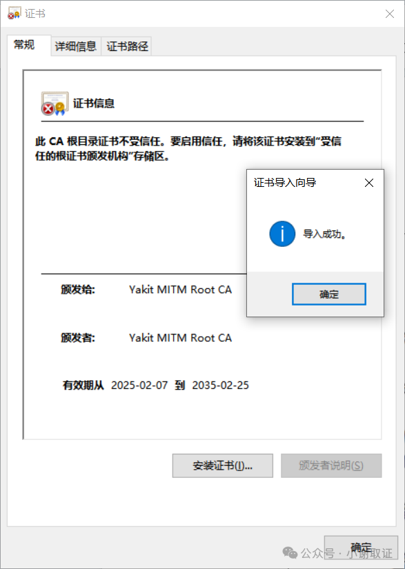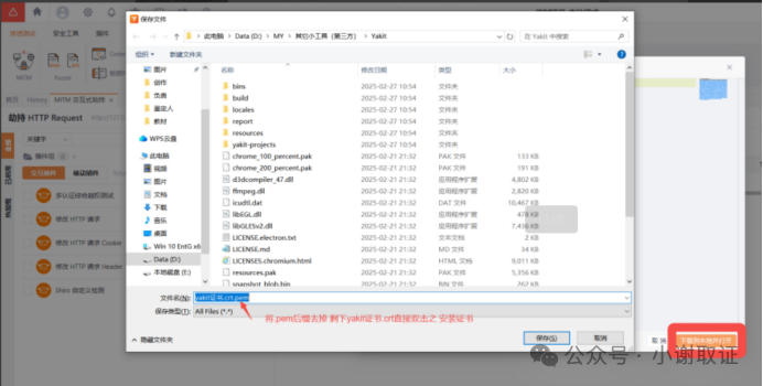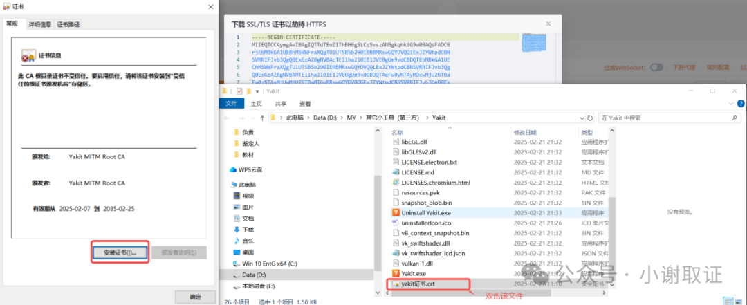 7.下载证书文件时要注意将.pem后缀去掉,留下“yakit证书.crt” 直接双击即可安装。