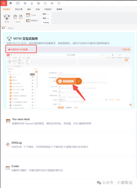 4.这边会提示“证书”未配置,我们先点击“启动劫持”按钮即可下载安装证书
