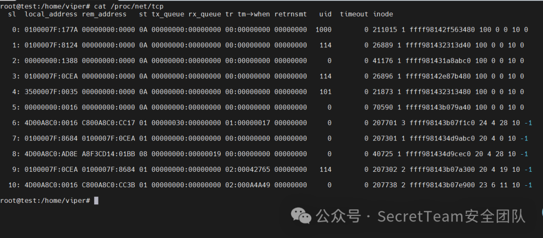 包含 TCP 套接字表。可用于枚举网络连接和侦听端口。uid 字段保存套接字创建者的有效 UID。IP 地址和端口以十六进制格式显示。如果“rem_address”为空,“local_address”表示侦听套接字。在这种情况下,机器侦听 0100007F:0FA0(等于 127.0.0.1:4000)。地址采用小端序。