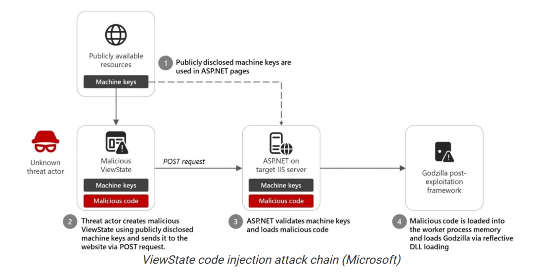 微软在2024年12月观察到一起攻击事件,攻击者使用公开的密钥向目标IIS服务器部署了Godzilla后渗透框架,该框架具备恶意命令执行和Shellcode注入功能。微软已识别出超过3000个公开的密钥,这些密钥都可能被用于ViewState代码注入攻击。以往的ViewState代码注入攻击多使用从暗网论坛购买的被盗密钥,而此次攻击中使用的公开密钥存在于多个代码库中,开发者可能直接将其复制到代码中而未进行修改,因此风险更高。