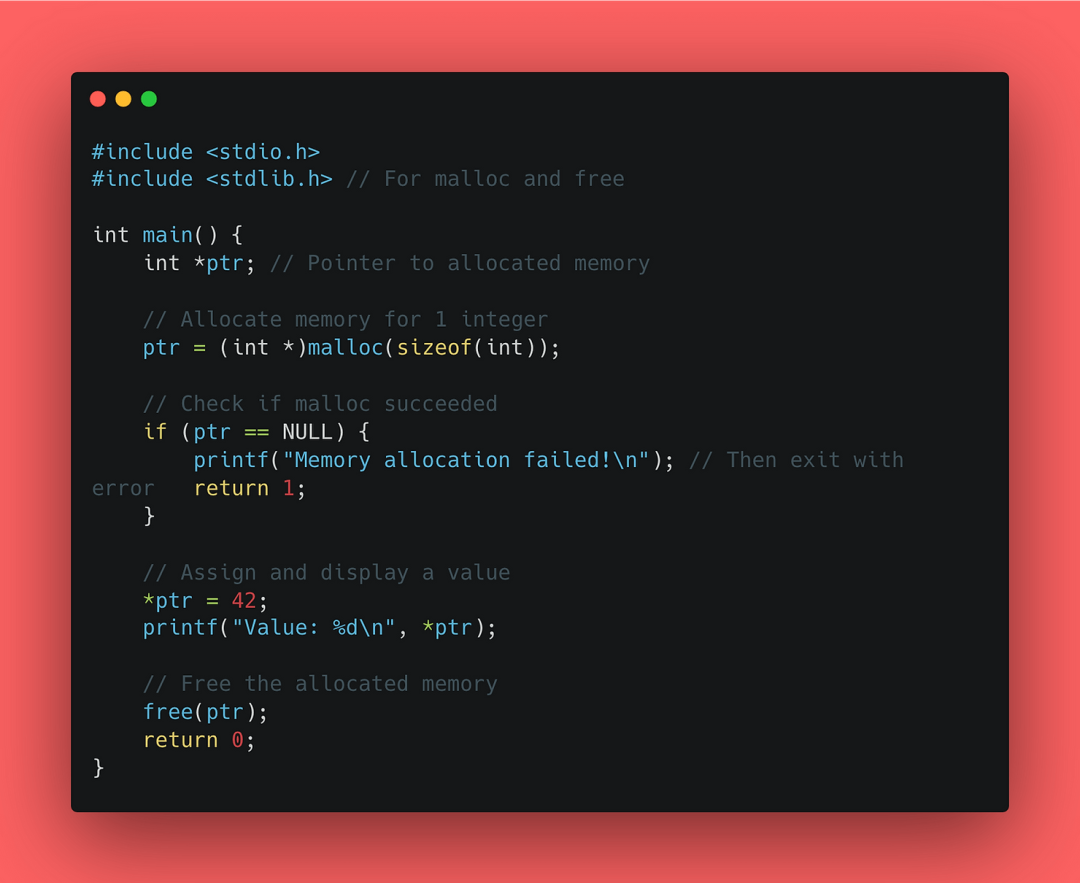 #include <stdio.h>#include <stdlib.h> // For malloc and freeint main() { int *ptr; // Pointer to allocated memory // Allocate memory for 1 integer ptr = (int *)malloc(sizeof(int)); // Check if malloc succeeded if (ptr == NULL) { printf("Memory allocation failed!\n"); // Exit with error return1; } // Assign and display a value *ptr = 42; printf("Value: %d\n", *ptr); // Free the allocated memory free(ptr); return0;}
