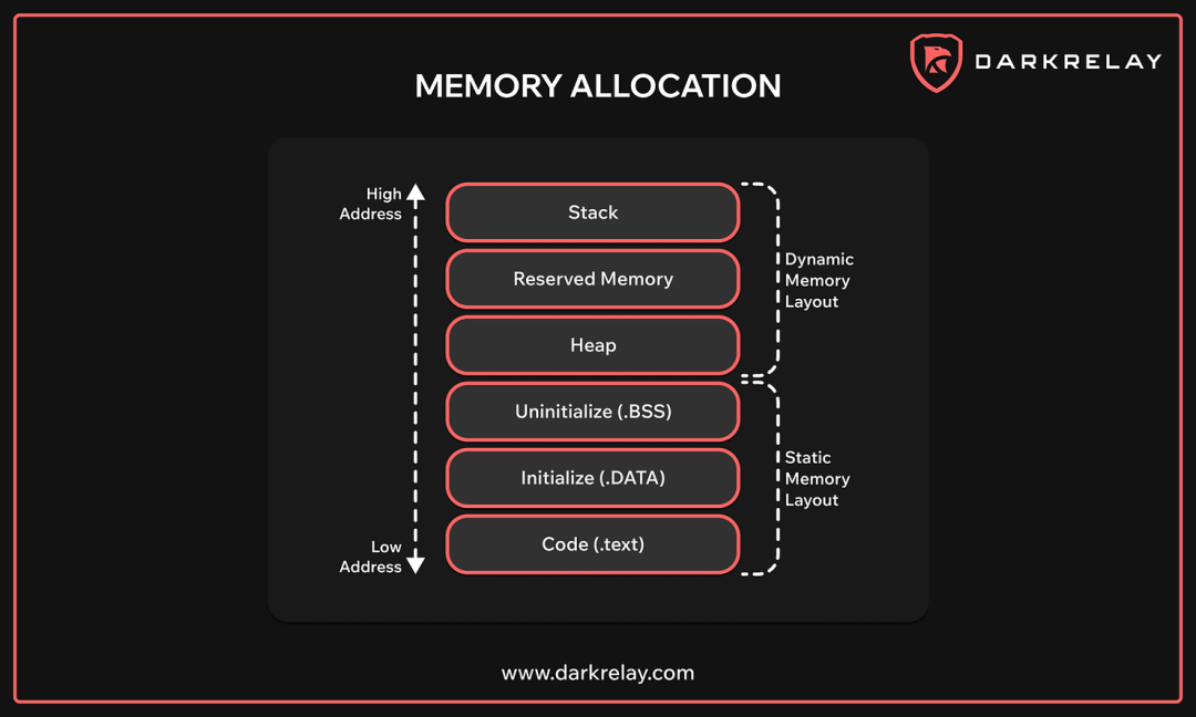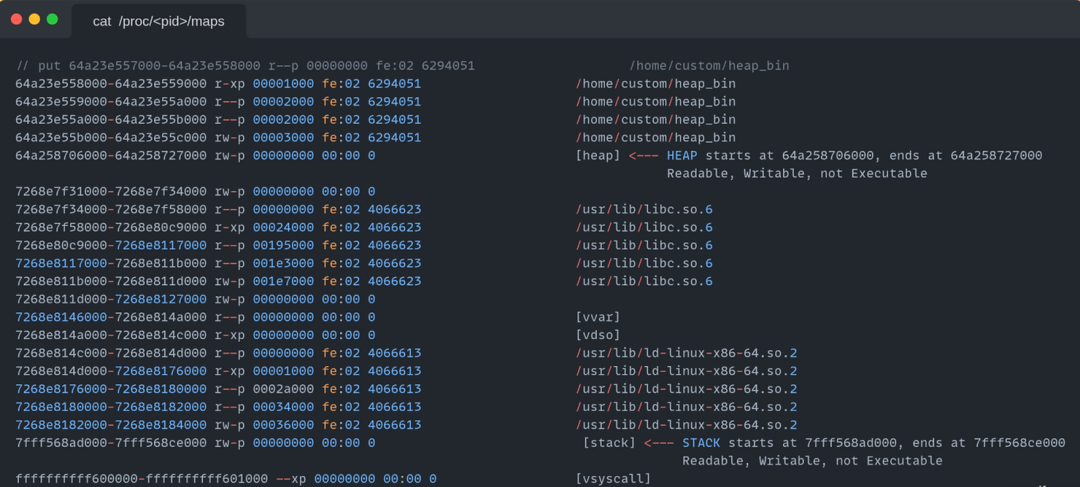 堆 (heap) 和栈 (stack) 内存段应仅设置为可读和可写,而不应具有可执行权限。这是因为如果攻击者能够劫持程序控制流并操纵指令指针 (RIP/x64 位或 EIP/x32 位),他们将能执行任意代码。