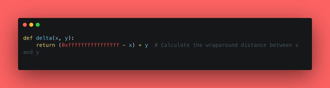def delta(x, y): return (0xffffffffffffffff - x) + y # Calculate the wraparound distance between x and y