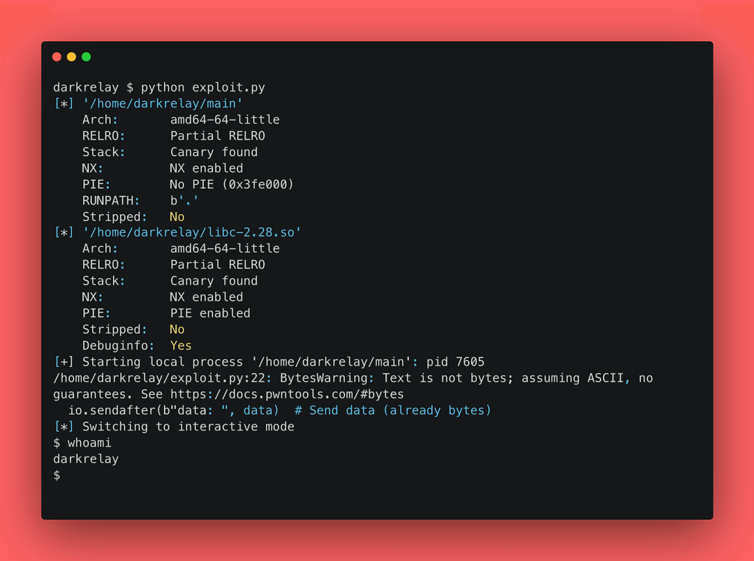 由于 PIE(地址无关可执行文件)被禁用,二进制文件及其关联库每次都会加载到相同地址。这使我们能够可靠地利用 libc 地址泄漏来执行系统命令