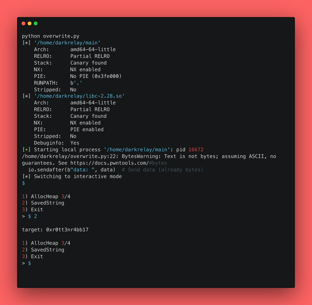 通过仔细执行这些步骤,我们可以重定向程序流并通过覆写的__malloc_hook 执行预定命令