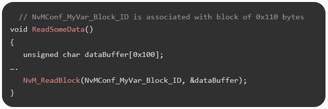 如果提供的变量是全局变量,NvM_ReadBlock将覆盖邻近的全局变量。这可能会导致代码中出现未定义的行为。
