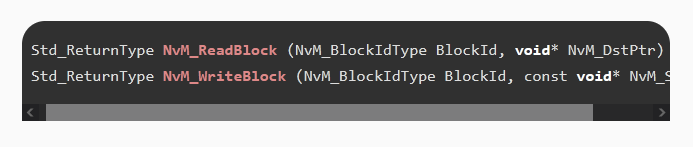 我们在NvM模块中遇到了一组函数:NvM_ReadBlock, NvM_WriteBlock和NvM_RestoreBlockDefaults,这组函数通常用于在NVM中加载和存储设备设置(如EEPROM, NAND, NOR内存等)。