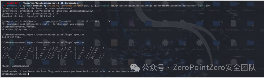 通过DCSync(其实就是当前服务器账户拥有活动目录的复制和读取权限,并通向域控发送同步活动目录让域控认为你也是域控机器 ,从而向你同步数据)进行dumphash,成功获取域管hash,探测时也发现DC是开启445端口和139端口的,直接 psexec后着smbexec横向到DC上