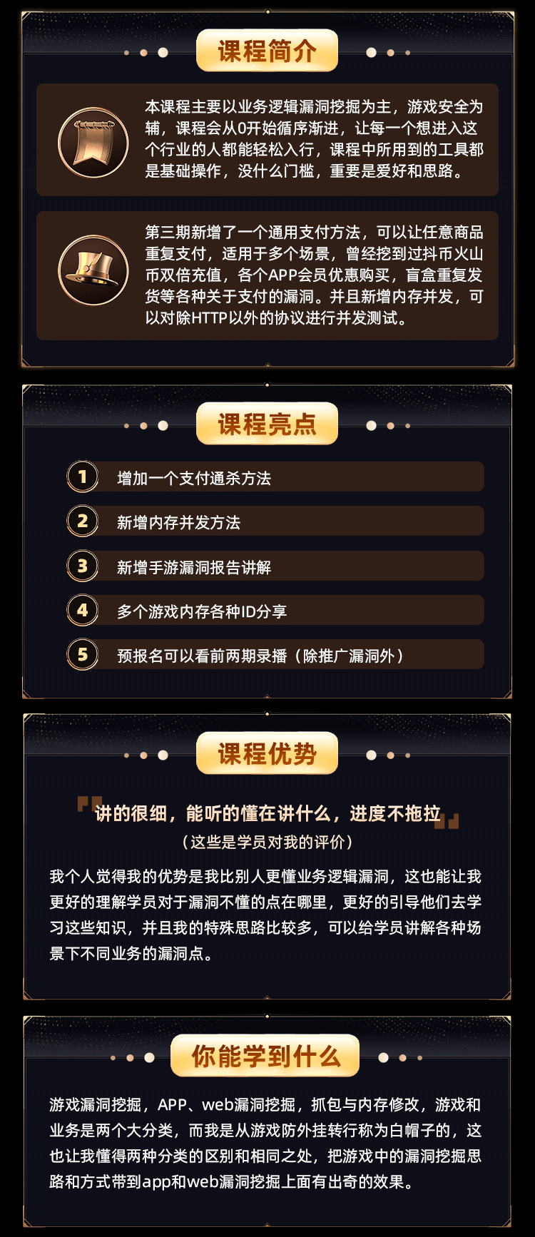 关于SRC漏洞挖掘可能有些同学不是很了解,SRC有非常多的业务,那些老业务、老测试方式已经越来越卷了,而我这次的课程将带大家往手游安全方面拓展,并且针对老业务带领大家去测试一些新接口,从app、web、游戏,多个角度讲解漏洞,学会多种业务的漏洞挖掘。通过“漏洞推演-绕过设计-防御升级”的三段式教学,培养独立挖掘复杂逻辑漏洞的能力。