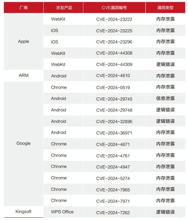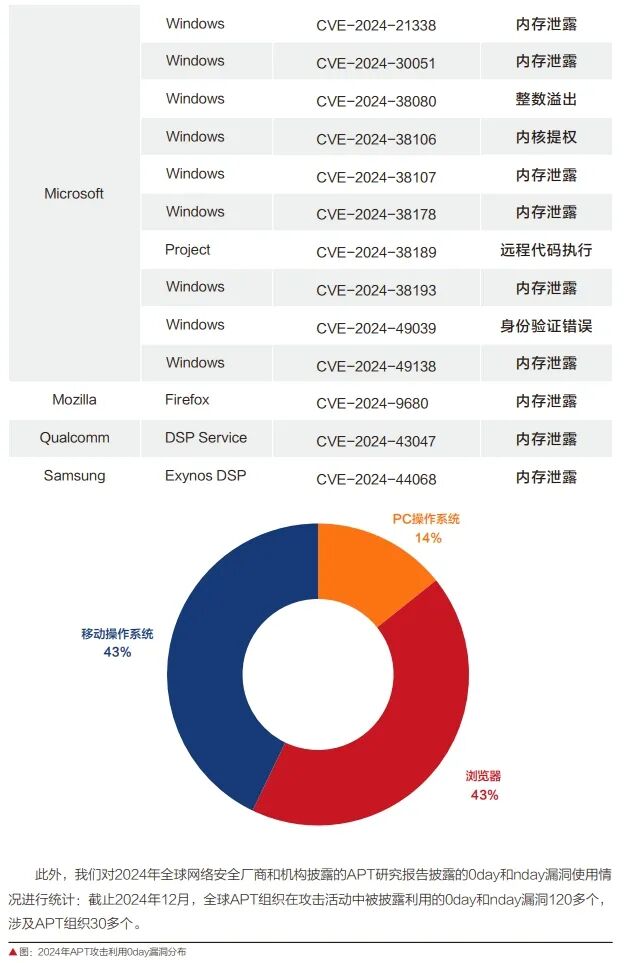 一是针对移动端系统0day漏洞利用数量增长明显。截至2024年12月,全球APT组织在攻击活动中被披露利用的0day和nday漏洞120多个,涉及APT组织30多个。其中,APT组织使用的针对移动端系统的0day漏洞占比增长明显。