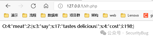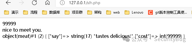 此时我们就是修改了序列化字符串中变量的值,将它从198修改成了99999,刚好该参数在魔术方法__wakeup中,在反序列化时此魔术方法被触发,这样子我们的恶意参数就生效了,原本程序想要输出198,结果被我们篡改成了99999。