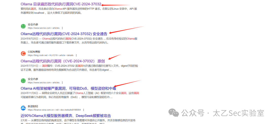 根据互联网上披露,2024 年 6 月 24 日, CVE-2024-37032 Ollama 目录遍历致代码执行漏洞。由于通常情况下 Ollama 没有认证授权,攻击者可利用相关 API 结合目录遍历漏洞造成远程代码执行,控制服务器。