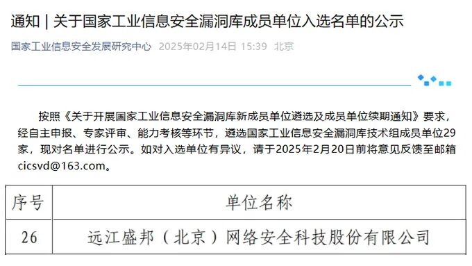 近日,国家工业信息安全发展研究中心公示了国家工业信息安全漏洞库(CICSVD)成员单位名单,