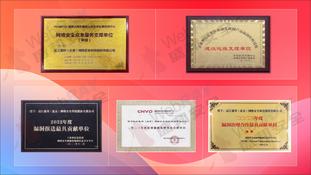 盛邦安全积极参与漏洞发现、风险预警及应急响应等工作,曾获得CNVD原创漏洞挖掘能力满星评价、年度原创漏洞发现突出贡献奖、CNNVD重大预警报送专项奖、CSTIS漏洞报送最具贡献单位等多项认可,