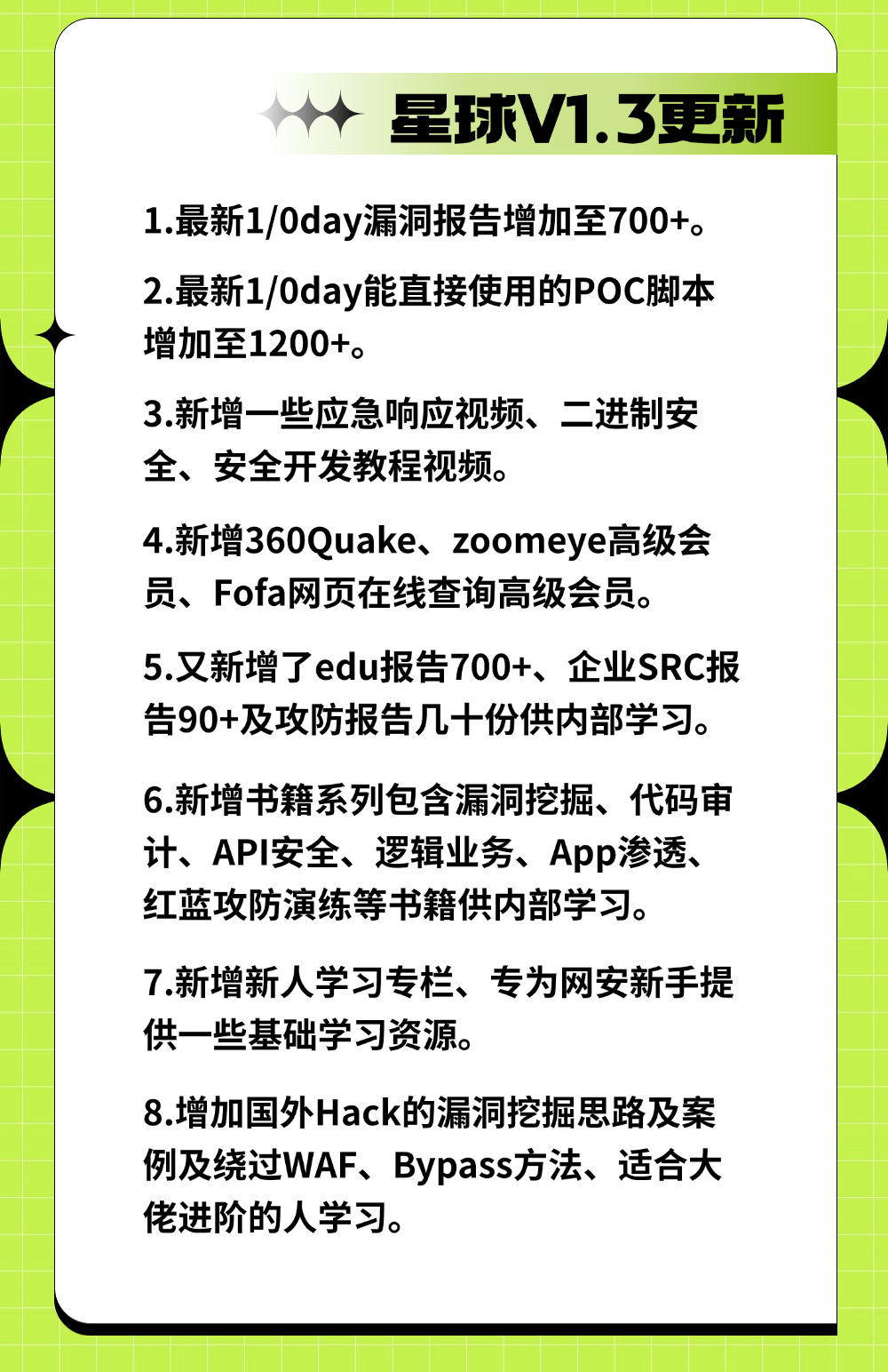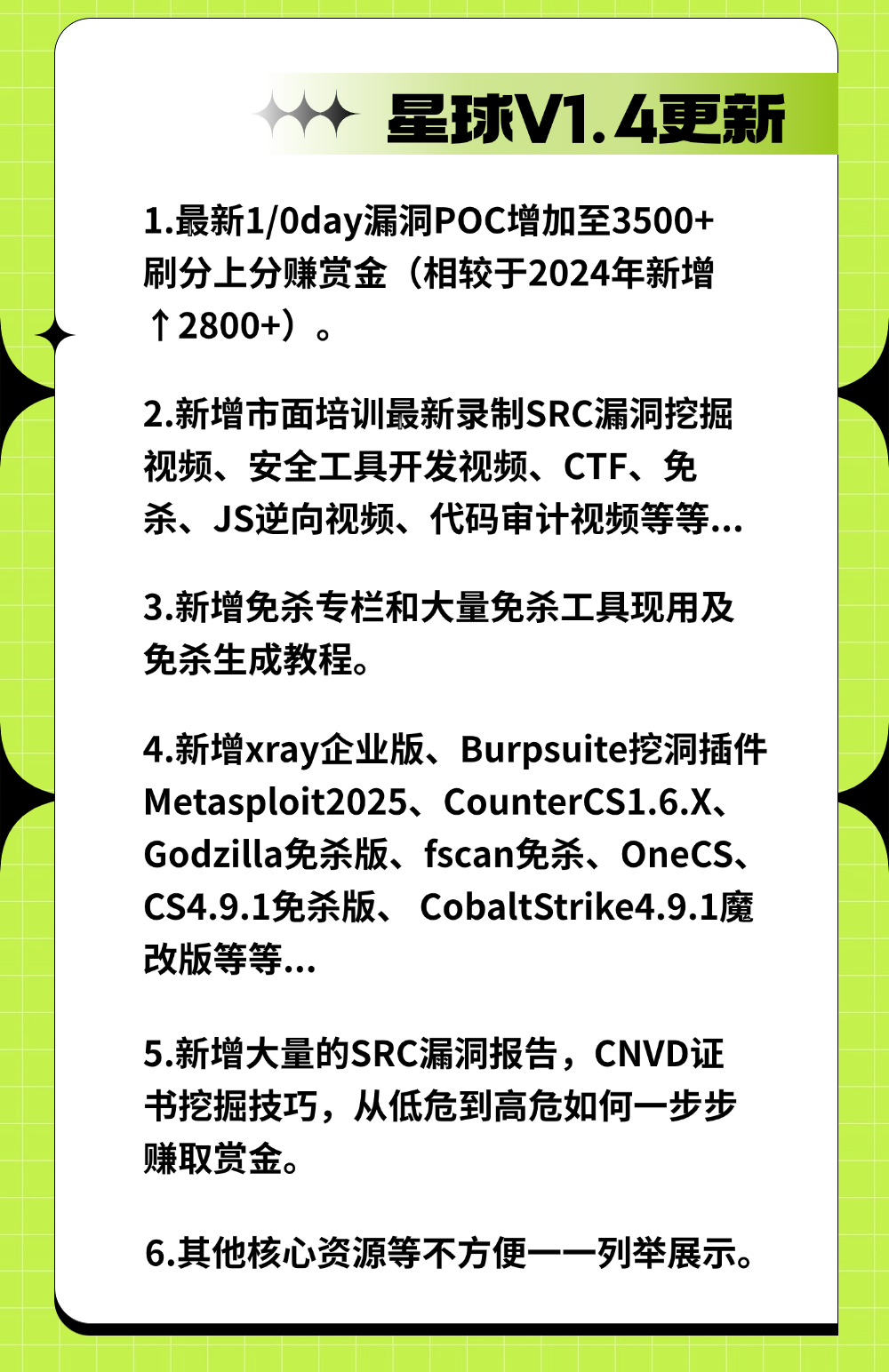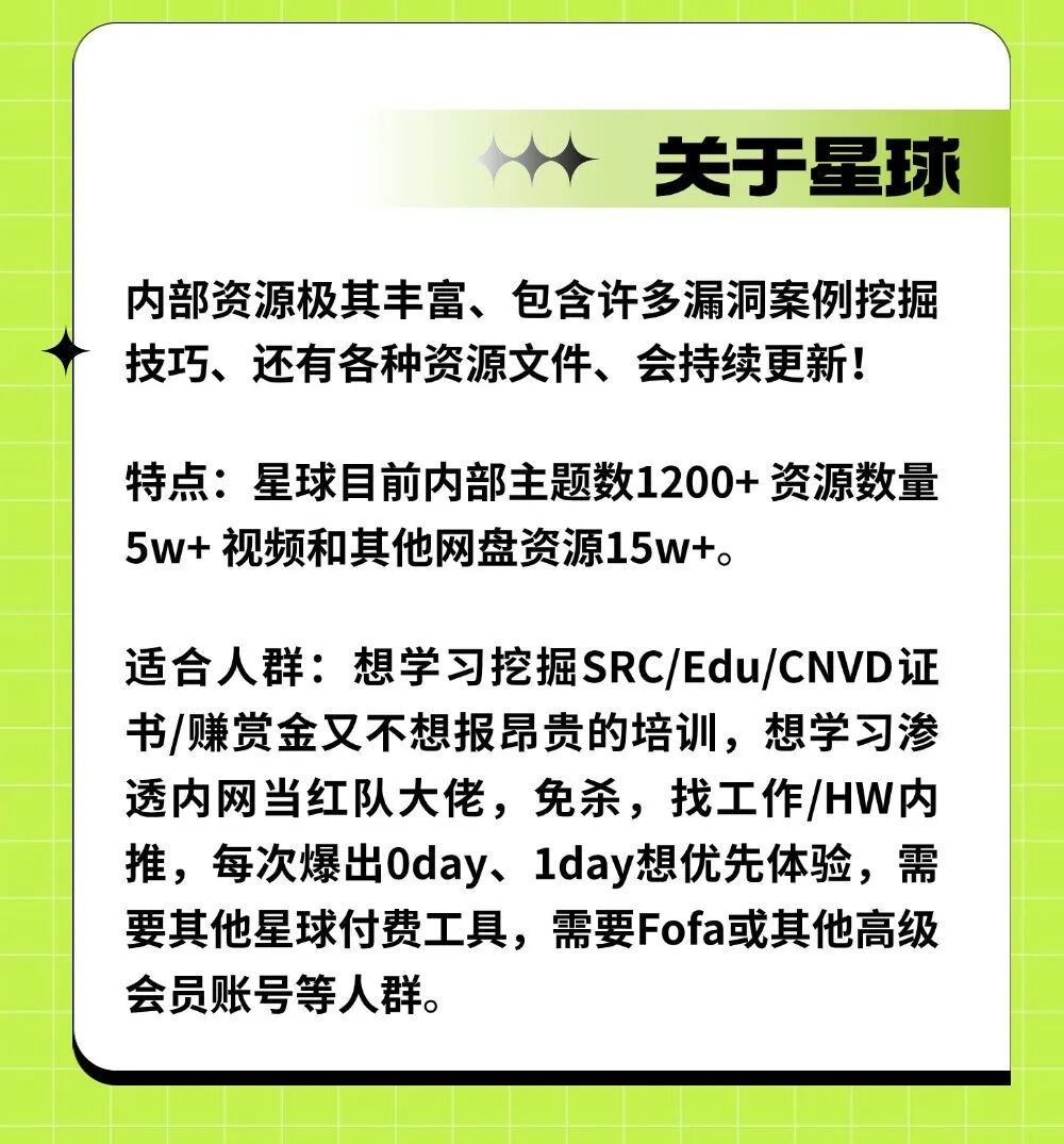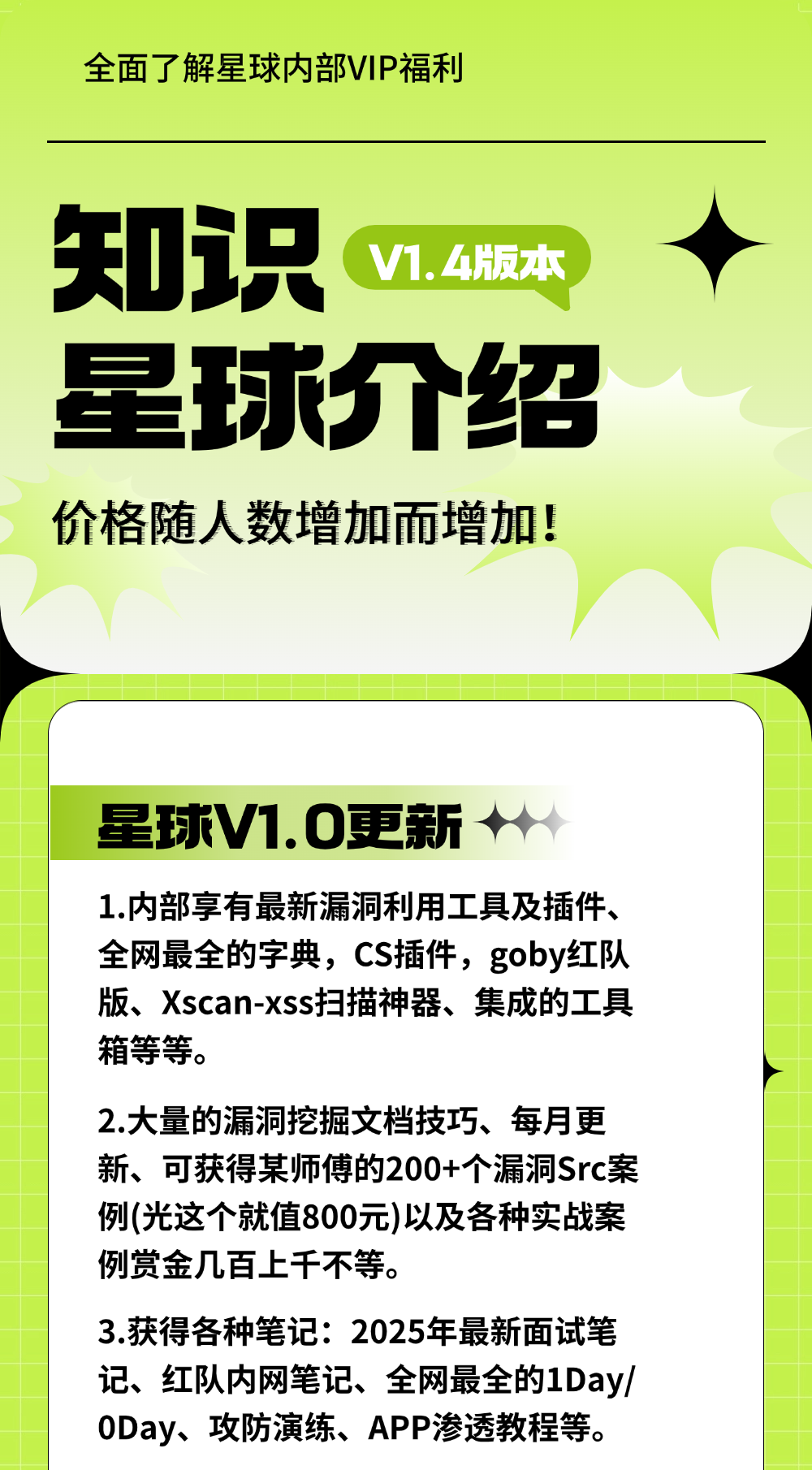 师傅们入股我的星球绝对不亏,几十块钱能学习到很多东西,闲鱼,淘宝卖src,edu报告都几十元几百元一份而且还不更新,还有卖各种工具的,有卖fofa,quake账号的几十元一个月,而我这边除了包含这些之外还有其他资源,别的星球没有的我这里会有,别的星球有的我这边也会有(1500多位师傅的选择)。