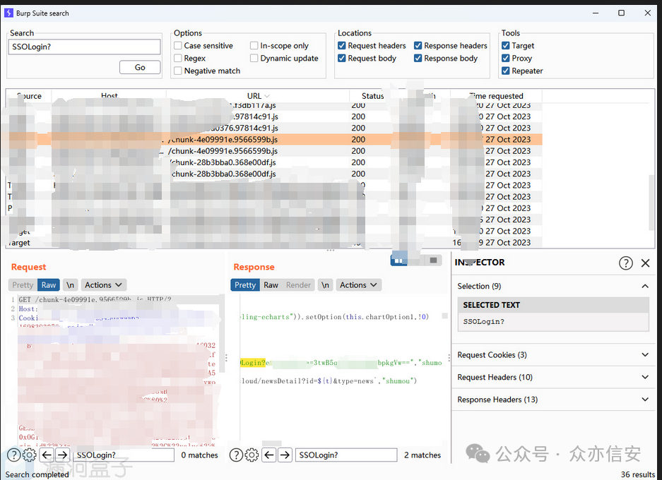 通过在burp中对网站进行搜索看是否有无SSOLogin?、Login?等关键字,因为有些系统它在js中泄露了某些关键接口可以导致用户进行登录其他系统