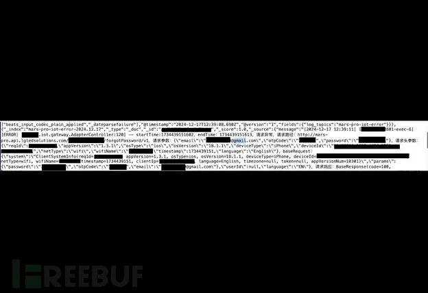 许多记录标有“Mars-pro-iot-error”或“SF-iot-error”,其中包含令牌、应用版本、设备类型和IP地址以及SSID凭证。