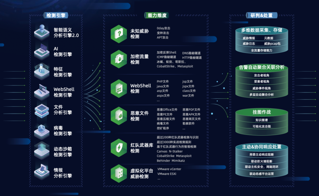 集成了语义分析引擎、人工智能引擎、入侵检测引擎、病毒引擎、威胁情报以及动态沙箱,能够使用智能语义分析技术,采用无规则检测方式,摆脱了对正则特征库的依赖。同时结合动态沙箱检测技术,能够有效应对0day以及APT等高级威胁检测。