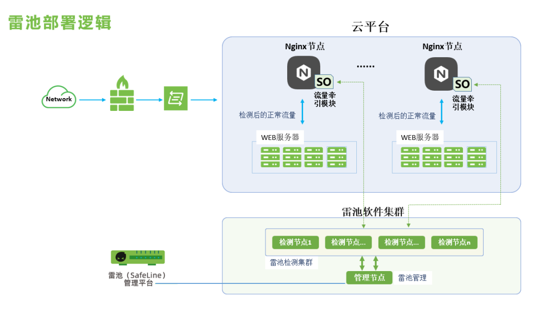 雷池(SafeLine)多租户能力,联动MSS多租户方案满足客户需求,通过SO模块嵌入多个Nginx上进行引流,实现http流量牵引及攻击阻断。