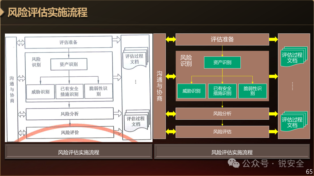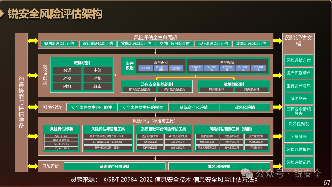 风险评估架构图有七个要素:沟通协商与评估准备、风险评估全周期、风险评估文档,然后就是把风险评估过程拆解成了四个阶段:风险识别、风险分析、风险评估和风险评价。