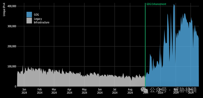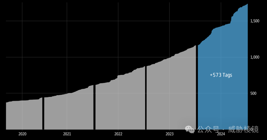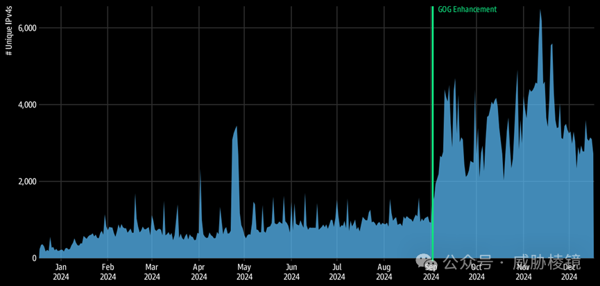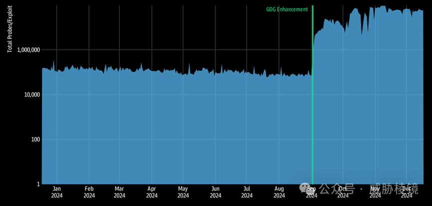 这些漏洞波及面的情况如下所示,注意数量大幅度增长主要是由于观测系统扩大了覆盖面而非实际攻击暴涨。