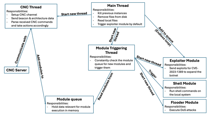 研究人员表示:“虽然这个恶意软件样本与其他僵尸网络有相似之处,但它与广泛使用的 Mirai 和 Mozi 等僵尸网络仍有区别。”
