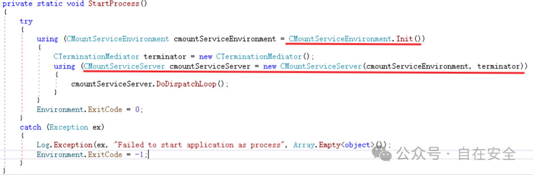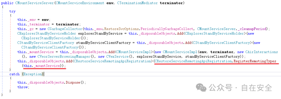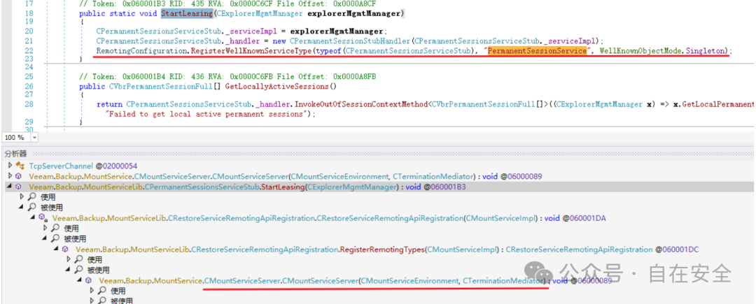 Veeam.Backup.MountService.Program.StartProcess 函数中实例化了 CMountServiceServer 对象,然后通过 StartLeasing 函数注册该 .NET Remoting 服务,终结点 URI 取值为 PermanentSessionService :