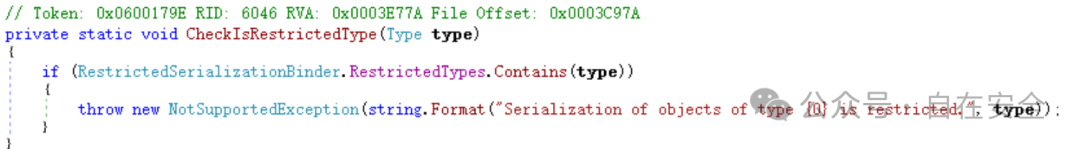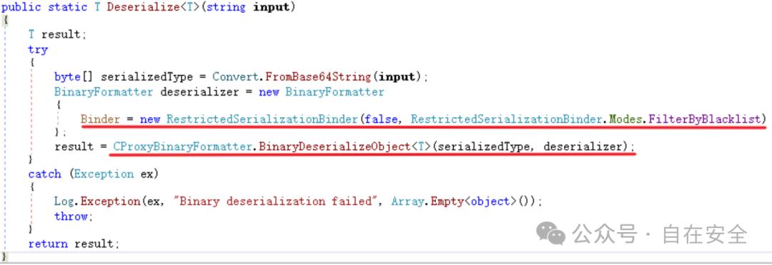大部分已经曝光的 gadget 被加入了黑名单,但是也有一些比较新的链被遗漏了,比如 ObjRef 。那么哪些地方用到了黑名单呢?通过搜索找到了 CProxyBinaryFormatter 类,该类中的 Deserialize 函数在反序列化时采用的是黑名单方式: