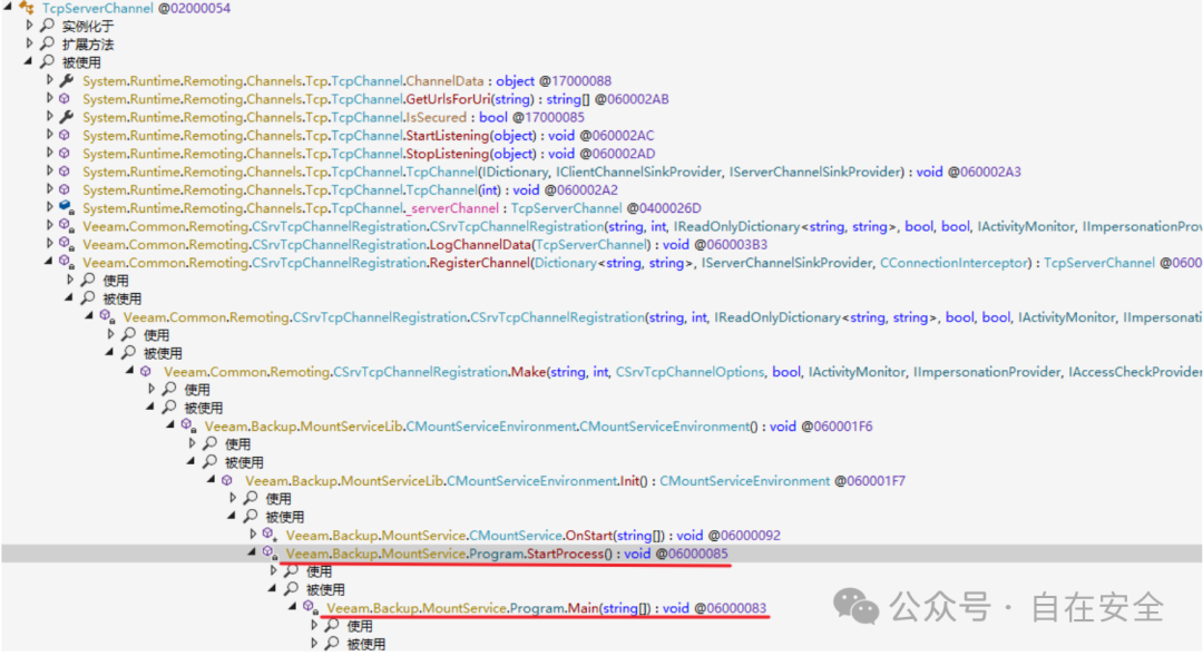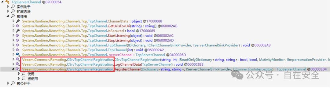 以 Veeam.Backup.MountService.exe 为例,启动的服务端口为 6170 ,分析 TcpServerChannel 关键字,找到了其中一个实现类 CSrvTcpChannelRegistration :